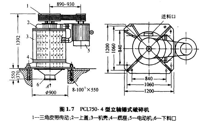 立軸捶式破碎機(jī)由上蓋、機(jī)殼、立軸轉(zhuǎn)子、底座和傳動(dòng)裝置等部分組成(參見圖1.7)。上蓋一側(cè)設(shè)有喂料口,機(jī)殼內(nèi)裝有反擊板,中 心立軸轉(zhuǎn)子對(duì)稱布置有板錘或鏈錘,傳動(dòng)采用異步電動(dòng)機(jī)和三角皮帶,底座下部設(shè)有出料溜子。物料均勻喂入近料口,自由墜落過(guò)程中 被高速錘頭錘擊,物料在錘頭與反擊板之間又相互沖擊,被粉碎物料由底部排出。