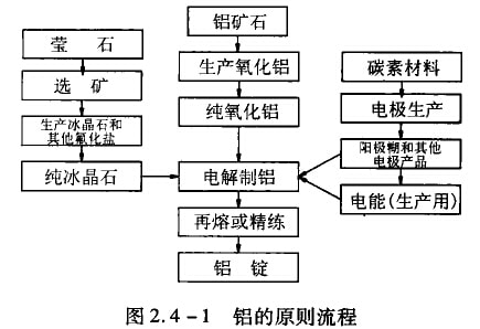 自1886年在冰晶石熔體中電解氧化鋁的方法實驗成功后,此法一直是生產(chǎn)金屬鋁的唯一方法。它包括從鋁礦石生產(chǎn)氧化鋁以及氧化鋁電解兩個主要過程,F(xiàn)代生產(chǎn)鋁的原則流程如圖2.4-1所示。