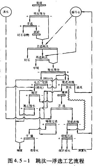 1)跳汰一浮選工藝流程見圖4.5-1。它是最常見的選煉焦用煤的工藝流程。