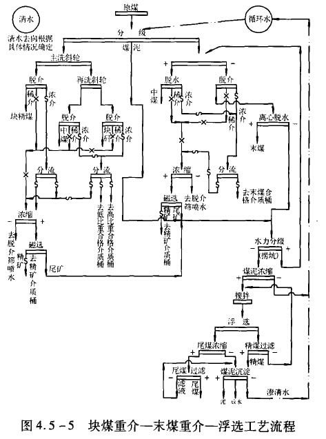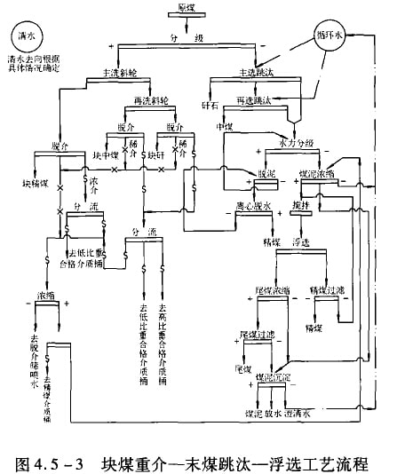 3)塊煤重介—末煤跳汰一浮選工藝流程見圖4.5-3。塊煤含量多的中等可選性和難選的煉焦煤,常采用這種流程。