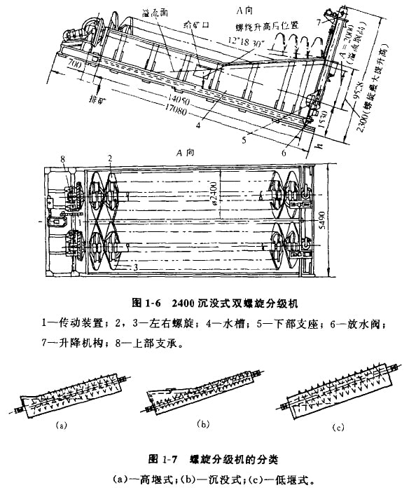 螺旋分級機(jī)的分類按槽內(nèi)螺旋的數(shù)目可分為單螺旋分級機(jī)和雙螺旋分級機(jī),按分級面的高低可分為高堰式、低堰式和沉沒式3種螺旋分級機(jī)(見圖1-7)。