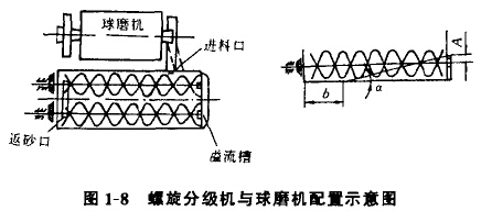 螺旋軸的長度由溢流堰高度A、槽體傾角α和返砂端長度b決定(見圖1-8)。溢流堰高度習(xí)慣上指溢流堰頂端至螺旋軸下端軸中心線的斜高。返砂端長度b根據(jù)配套磨機(jī)的尺寸和位置確定。