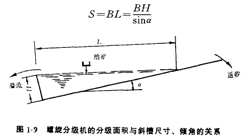 槽體寬度影響分級面積的大小,也影響到溢流的粒度和溢流生產(chǎn)能力。如圖1-9所示,槽體分級液面長為L,槽體寬度為B,下端高為H,傾角為α,分級面積S為: