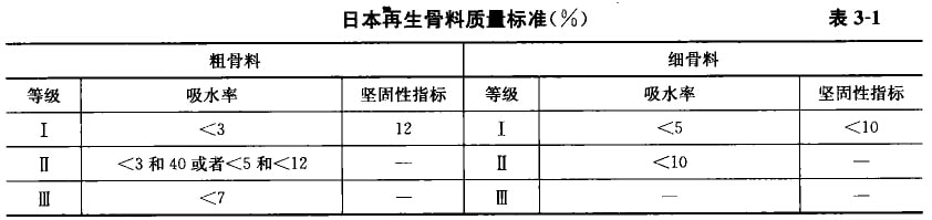 再生混凝土骨料多數(shù)參考普通混凝土骨料的分類方法進(jìn)行分類。在我國(guó),研究者多根據(jù)《普通混凝土用砂、石質(zhì)量及檢驗(yàn)方法標(biāo)準(zhǔn)》(JGJ52-2006),將粒徑在0.16-5.00mm之間的再生月料稱再生細(xì)骨料,粒徑大于5mm的稱再生粗骨料。也有學(xué)者考慮到再生細(xì)骨料小含有細(xì)小水泥漿顆粒,將再生細(xì)骨料的粒徑范圍定為0.08-5.00mm。日本于1994年4月頒布了《再生混凝土材料質(zhì)量試行條例》,給出了再生骨料、再生基層材料、填充材料的質(zhì)量標(biāo)準(zhǔn),并劃分了再生骨料的質(zhì)量等級(jí),如表3-1所示,表中堅(jiān)固性指標(biāo)與我國(guó)壓碎指標(biāo)意義相同。