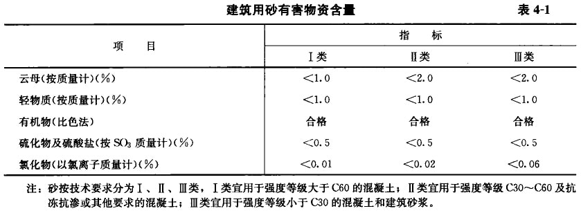 我國(guó)東南沿海地帶,在工程施工時(shí)普遍使用談化海砂作為混凝土細(xì)骨料。根據(jù)現(xiàn)行國(guó)家標(biāo)準(zhǔn)《建筑用砂》(GB/T14684-2000)規(guī)定:砂中如含有云母、輕物質(zhì)、有機(jī)物、硫化物及硫酸鹽、氯鹽等有害物質(zhì),其含量應(yīng)符合表4-1的規(guī)定。海砂一般具有粒度適宜(多為中砂)、顆粒堅(jiān)硬、級(jí)配良好、含泥量少等優(yōu)點(diǎn),但存在的問(wèn)題是含鹽量及貝殼含量較高。