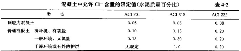在試驗(yàn)研究和工程實(shí)踐的基礎(chǔ)上,世界上許多國(guó)家的規(guī)程、規(guī)范、政府指令性文件中,都作了相應(yīng)的氯離子限量規(guī)定,對(duì)混凝土中c1—含量實(shí)行總量控制。不論以何種途徑進(jìn)入到混凝土中,都不允許Cl-含量超出該限定值,并以此“限定值”作為新建工程質(zhì)量控制的重要技術(shù)指標(biāo)之一。表4-2列出了美國(guó)混凝土學(xué)會(huì)(ACI)的相關(guān)規(guī)定。