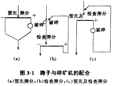 篩分是將礦石按粒度分成二種或多種級別的過程。篩分時,通過篩孔的顆粒稱為篩下產(chǎn)品;未涌過篩孔的顆粒稱為篩上產(chǎn)品。在選礦廠采用的篩分作業(yè)有預(yù)先篩分和檢查篩分兩種。預(yù)先篩分是礦石進入破碎機前的篩分。其目的是除去粒度已合格的產(chǎn)品,防止物料的過破碎和提高破碎機的生產(chǎn)能力。檢查篩分是礦石經(jīng)破碎后進行的篩分。為了控制破碎產(chǎn)品的粒度,使不合格的產(chǎn)品返回破碎機再破碎,見圖3-1。