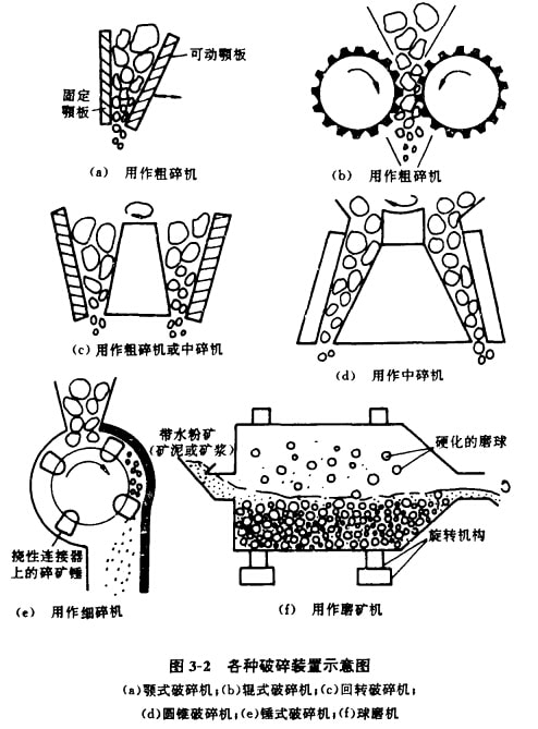 由于進入選礦廠的礦塊很大,而要求入選的粒度又很細(xì)。同時,又受到選礦設(shè)備破碎比的限制。因此,物料的破碎只能分階段逐步完成。不同階段有適當(dāng)?shù)脑O(shè)備可供選擇應(yīng)用。而一定的破碎設(shè)備又在適合的航度范圍內(nèi)才能高效率的工作。一般破碎階段分為: