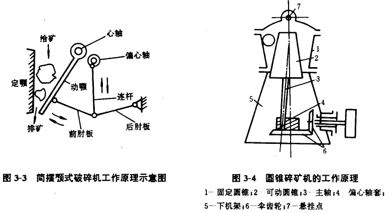 用于粗碎作業(yè)的主要是顎式破碎機。它的規(guī)格用給礦口寬度B和長度L表示。B大于600mm為大型、300-600mm為中型、小于300mm為小型。圖3-3示出一種簡單顎式破碎機工作原理圖。當(dāng)皮帶輪帶動偏心袖旋轉(zhuǎn)時,偏心頂點牽動連桿上下運動。也就是牽動前后推力板作舒張及收縮運動。從而傳動領(lǐng)時而瓊近定額,時而又離開;動顎靠近定顎時就對破碎膠內(nèi)礦起壓碎作用。破碎了的礦石在動額后退時靠自重從破碎腔內(nèi)落下。