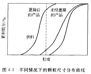 從圖4-1中可以看出供料以及產(chǎn)品的順粒尺寸分布曲線都是典型的“S”形。破碎過程中轉(zhuǎn)無英篩以限創(chuàng)出料的最大尺寸,則一些具有最大尺寸部分的物料在尺寸并未減小的情況下通過破碎系統(tǒng)是完全訂可能的。而從整體上講,大部分顆粒的尺寸都減小了,這就使得該產(chǎn)品的PSD為一更寬的分布。如果系統(tǒng)中設(shè)有篦篩,則產(chǎn)品的PSD曲線明顯左移。然而,由于原物料和破碎后的廢物的形狀不規(guī)則,一些大于篦篩開孔尺寸的顆粒,從對(duì)角位置或以一端向下的形式而透篩的情況時(shí)有發(fā)生,因此,篦篩產(chǎn)品的PSD曲線的一段要超過篦篩尺寸。