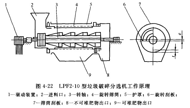 LPF2-10型垃圾破碎分選機工作原理如圖4-22所示。工作時,轉(zhuǎn)軸與旋轉(zhuǎn)篩筒分別在各自驅(qū)動裝置的帶動下,同向差動轉(zhuǎn)動。根據(jù)垃圾中各組分耐沖擊、耐壓縮和耐剪切力的不同,利用選擇性破碎分選原理,在轉(zhuǎn)軸刮板的撞擊、剪切作用下,將垃圾中能破砷的組分破碎,通過篩筒篩出,輸往后續(xù)系統(tǒng);不能破碎的組分就從旋轉(zhuǎn)篩筒木端排出機外,從而達到在一機內(nèi)同時進行破碎和篩分的目的。