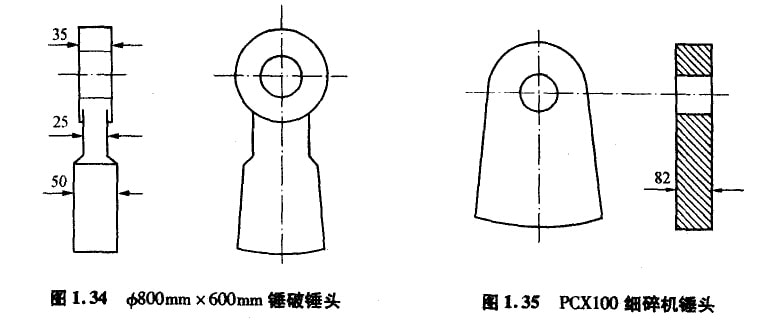 例如,老型號(hào)錘式破碎機(jī)錘頭的結(jié)構(gòu)形狀如圖1.34,立軸式破碎機(jī)錘頭也類似。當(dāng)初設(shè)計(jì)思想是盡可能減輕非磨損部位(錘柄)的重量,節(jié)約材料,降低成本。所以,錘柄部位很薄,只有采用高錳鋼或低碳合貧鋼材質(zhì)才能保證其不斷裂,但耐磨性很差,無法用于熟料的破碎。用高硬度耐磨材料制作該錘頭,很容易斷裂,無法可靠應(yīng)用。