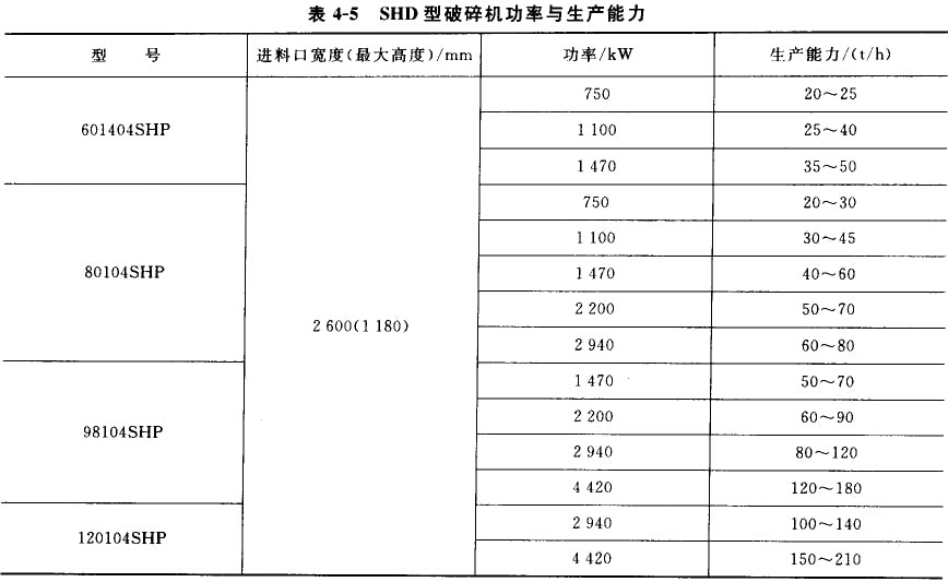 立式破碎機(jī)世界上使用較少,90%以上的用廣都選用臥式。亨息爾公司的臥式破碎機(jī)與美國(guó)紐維爾公司的產(chǎn)品相似,這里不再贅述,其功率與作產(chǎn)能力見表4-7。