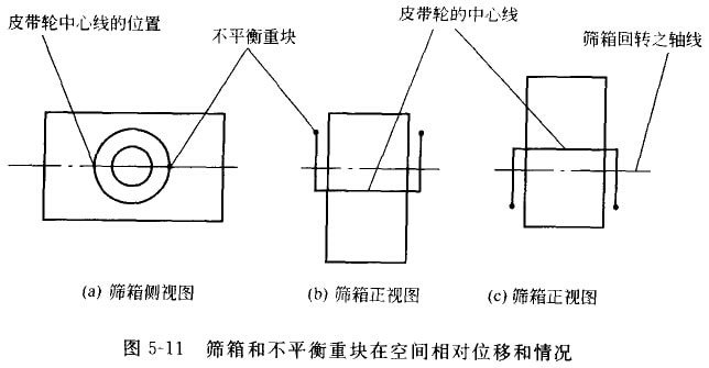 圖5-10是WK型圓振動篩構(gòu)造示意圖。篩箱1利用彈簧吊鏈裝置2懸吊起來,電動機(jī)3通過皮帶傳動裝置4帶動激振器軸5和不平衡重輪5回轉(zhuǎn),產(chǎn)生徑向的力向變化的離心慣件力(激振力),驅(qū)動篩箱做圓形(或近似圓形)的振動,被篩物料受篩面向上運(yùn)動的作用力被拋起,前進(jìn)了一段距離后,再落回到篩面上。如此反復(fù)進(jìn)行,并在從給科端向排料端運(yùn)功的過程中完成篩分。振動篩的轉(zhuǎn)數(shù)一般選擇在遠(yuǎn)離共振區(qū)。即工作轉(zhuǎn)數(shù)比共振轉(zhuǎn)數(shù)大幾倍。由于在遠(yuǎn)離共振區(qū)工作,所以振幅比較平穩(wěn),彈簧剛度小,彈簧軟,而且激振力方向與篩箱振動方向相反。當(dāng)不平衡重塊轉(zhuǎn)到上方[圖5-11(b)]時,激振力向上,而篩箱向下;當(dāng)不平衡重塊轉(zhuǎn)到下方[圖5-11(c)]時,激振力向下,而篩箱向上。在篩箱的前、后方各設(shè)有水平彈簧,防止在啟動或停機(jī)時,由于共振而產(chǎn)生強(qiáng)烈搖擺。由上述可知,簡單慣性閱振功篩激振器的軸和皮帶輪勺篩箱一起都參與振動,篩箱做振幅為A的圓振動,其軸和皮帶輪在空間也做半徑為A的圓振動。因此,皮帶輪的小心線在生間的位置是變化的。