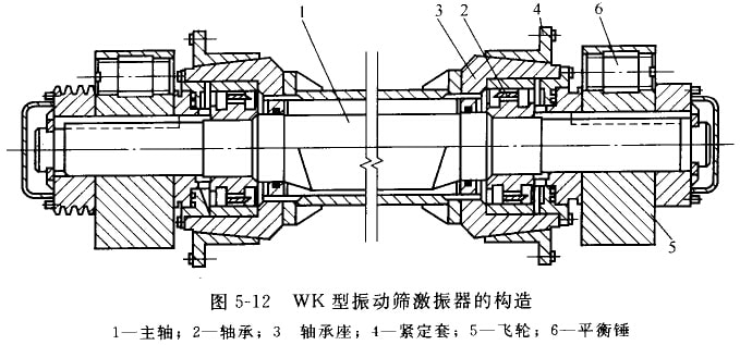 WK型圓振動篩激振器的構(gòu)造如圖5-12所示。在這種激振器中,產(chǎn)生振動的不平衡重量分別布置在軸1的中段和構(gòu)端的飛輪5上。這樣的結(jié)構(gòu),一方面可以減小軸的彎矩,同時也便改變激振器的激振力,達(dá)到調(diào)整篩于振幅的目的。鈾1用一對雙列向心球面滾子軸承裝在軸承席3上,并通過緊定套4與篩箱連接。激振器的軸承,外側(cè)采用迷宮式密封,內(nèi)側(cè)用毛氈密封,并用套筒將侗心軸封閉起來。