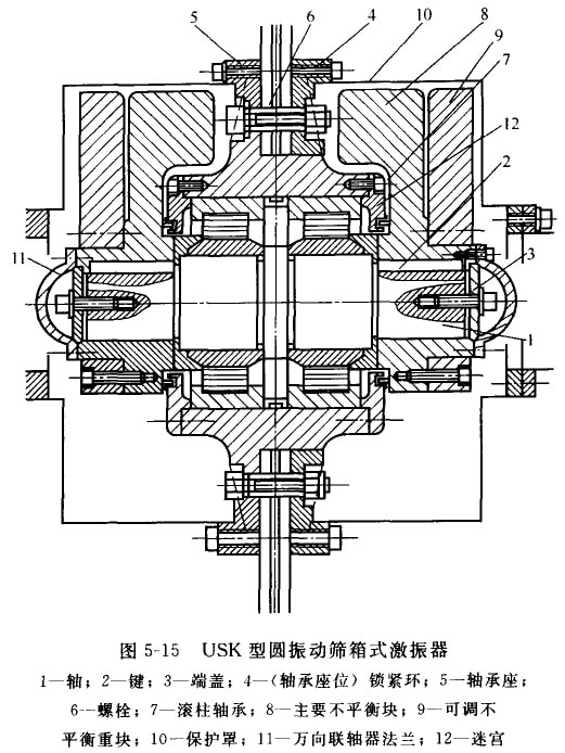 我國引進(jìn)的前聯(lián)邦德國USK型圓扳動篩是一種電動機(jī)直接傳動的簡單慣性圓運(yùn)動振動篩,見圖5-13。