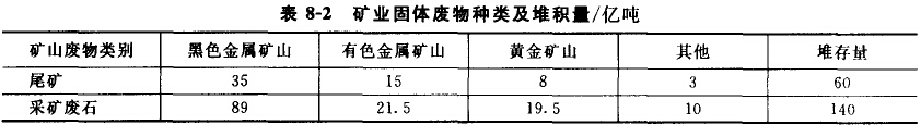 據(jù)統(tǒng)計(jì),我國礦業(yè)廢物的堆存望已達(dá)200余億噸(表8-2),占我國工業(yè)固體廢物堆積量的85%以上,并以2-3億噸的速度逐年增長。目前年排放尾礦約5億噸、采礦廢人4億噸、煤殲石1.5億噸、赤泥500萬噸、冶煉渣450萬噸。這些礦業(yè)廢物苦處理、處置不當(dāng),不僅侵占土地,給生態(tài)環(huán)境和人身健康造成嚴(yán)重危害,還格加劇排L場滑坡、泥石流、尾礦庫潰壩等工程災(zāi)害,浪費(fèi)有價資源,污染周圍水體、土壤和大氣,破壞生態(tài)植被、導(dǎo)致土地退化及沙漠化等一系列問題。