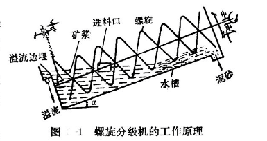 經(jīng)過細(xì)磨的礦漿從進(jìn)料口給入水槽,傾斜安裝的水槽下端為曠漿分級(jí)沉降區(qū),螺旋低速回轉(zhuǎn),攪拌礦漿,使大部分輕細(xì)顆粒懸浮于上面,流到溢流邊揠處溢出,成為溢流,進(jìn) 入下一道選礦工序,粗重顆粒沉降于槽底,成為礦砂(粗砂),由螺旋輸送到排礦口排出。如分級(jí)機(jī)與磨礦機(jī)組成閉路,則粗砂經(jīng)溜槽進(jìn)入磨礦機(jī)再磨。