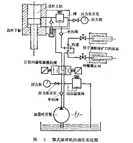 在調(diào)整前,應(yīng)先松開連接滑塊座與后機(jī)架間的螺帽及彈簧拉桿的螺帽,再啟動液壓油泵,向油缸中注油,使油缸活塞推動滑塊座向前移動,然后在滑塊座與后機(jī)架間 增減墊片,以達(dá)到調(diào)整排礦口的目的。調(diào)整完后將油缸中的油排出,擰緊滑塊座與后機(jī)架間的螺帽,并重新調(diào)整鎖緊彈簧的螺帽。排礦口調(diào)整的液壓系統(tǒng)見圖3。