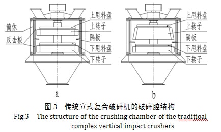 目前大多立式復合破碎機的破碎腔結構有兩種如圖3所示:a為上、下轉子圓柱形,b為上錐形、下圓柱形轉子,上、下轉子間的環(huán)形隔板或篦板將破碎腔分上、下兩部分,上下轉子圓周均布有錘頭,旋轉的轉子錘頭與反擊板之間形成環(huán)形間隙,且由上至下的間隙是由大到小,一般情況下,上部為中碎破碎腔,下部為細碎破碎腔。[2]、[3]