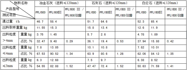 我們針對PFL老型和PFL-Ⅲ新型立式復合破碎機,通過現場多家用戶應用,對冶金石灰、白云石、石灰石三種物料進行大量測試,測試結果如表2(以PFL-1500和PFL-1500Ⅲ型為例):