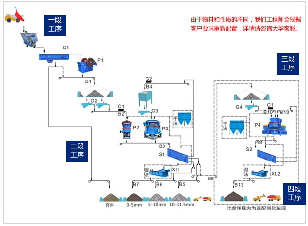 花崗巖的加工流程主要分為顎式破碎機的粗碎、反擊式破碎機或圓錐式破碎機的中細碎和制砂機的制砂整形三個階段。