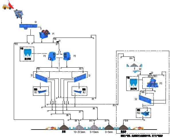 根據(jù)工程的需要,該系統(tǒng)也可以配置制砂系統(tǒng),用于生產(chǎn)合理級(jí)配的精品砂(如虛線框內(nèi)所示),當(dāng)需要生產(chǎn)精品砂時(shí),可以從一篩篩分車間篩分后分離出5-40mm的混合物料通過皮帶機(jī)輸送至制砂車間的半成品料倉,再通過振動(dòng)給料機(jī)將物料均勻的給至制砂機(jī),經(jīng)過制砂機(jī)破碎后的成品混合料再通過皮帶輸送機(jī)輸送至二篩篩分車間進(jìn)行篩分,從而分離出不同顆粒級(jí)別的成品。