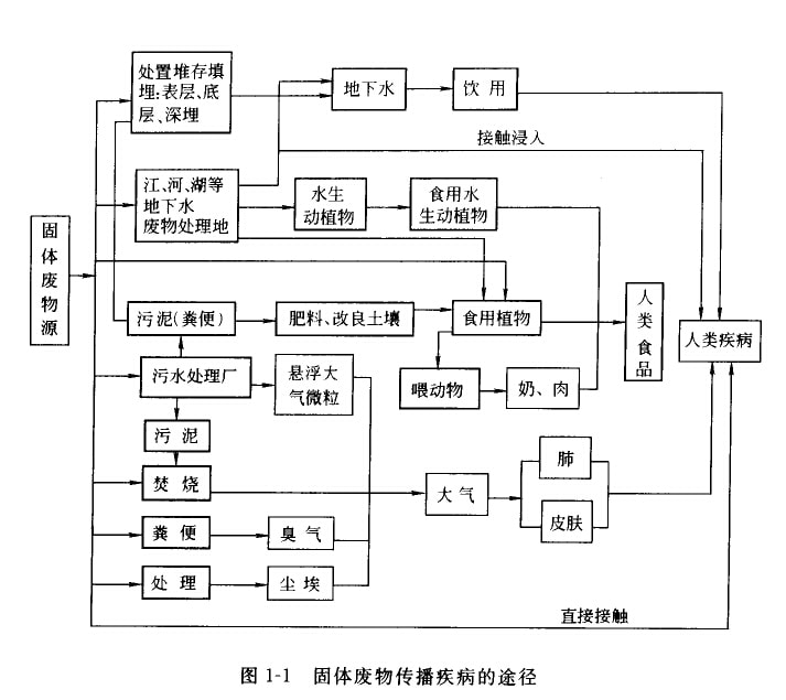 固體廢物特別是有害固體廢物,如處理、處置不當(dāng),具中的有毒有害物質(zhì)如化學(xué)物質(zhì)、病源微生物等可以通過外境介質(zhì)一大氣、土壤、地慶或地下水體進(jìn)人生態(tài)系統(tǒng)形成化學(xué)物質(zhì)型污染和病原體型污染,對人體產(chǎn)牛危害,同時(shí)破壞個(gè)態(tài)環(huán)境,導(dǎo)致不可逆生態(tài)變化。其具體途徑取決于固體廢物本身的物理、化學(xué)和生物性質(zhì),而凰與固體廢物處置所在場地的水質(zhì)、水文條件有關(guān),如:有些可通過燕發(fā)直接進(jìn)入大氣;但更多通過接觸浸入、食用或咽入受污染的飲用水或食物進(jìn)入人體。固體廢物傳播疾病的途徑見圖1—1。
