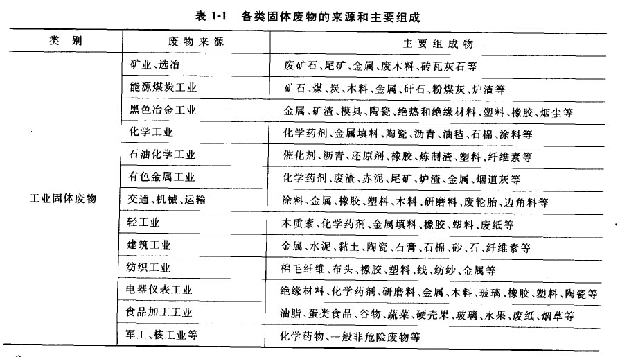 我國的工業(yè)固體廢棄物主要來自各個(gè)工業(yè)部門的個(gè)產(chǎn)環(huán)行和生產(chǎn)廢棄物,由于工業(yè)同體廢棄物常常具有毒性,破壞整個(gè)生態(tài)系統(tǒng)并對人體健康產(chǎn)生危害,因而越來越引起人們的重視,其中很多廢物劃人危險(xiǎn)廢棄物一類進(jìn)行涅慎處理。按行業(yè)可分為以下幾類:礦業(yè)、選冶,能源煤炭工業(yè),黑色冶金工業(yè),化學(xué)工業(yè),石油化學(xué)丁業(yè),有色金屬工業(yè),交通、機(jī)械、運(yùn)輸,輕工業(yè),建筑業(yè),紡糾工業(yè),電器儀表業(yè),食品加工業(yè),軍工、核工業(yè)等。表1—1中列舉了各類固體廢物的來源利主要組成。