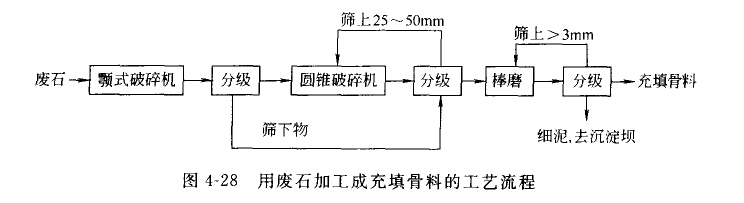 礦山開采過程中剝離及掘進(jìn)時(shí)產(chǎn)生的無工業(yè)價(jià)值的礦床圍巖及夾石成為廢石。廢石的排放量很大,目前我國(guó)度石主要用于生產(chǎn)建筑材 料和辦并充填料。無論是作為建筑材料還是作為礦井充填料,都必須將廢石破碎到一定的粒度,以滿足不同用途的要求。圖4—28 所示為以破碎廢石作為井下膠結(jié)充填月料的工藝流程。