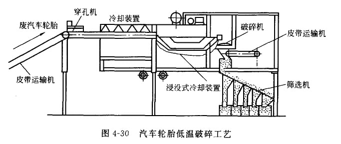 圖4—30所示為汽車輪胎低溫破碎上藝。經(jīng)皮帶運(yùn)輸機(jī)送來的廢輪胎采用穿孔機(jī)穿孔后,經(jīng)噴灑式冷卻裝置預(yù)冷,再送涅沒式冷 卻裝置冷卻。通過輥式破碎機(jī)破碎分離成“橡膠和夾絲布”與“車輪兇緣”兩部分,然后送至安合磁選機(jī)的皮帶 運(yùn)輸機(jī)進(jìn)行磁選。前者經(jīng)錘碎機(jī)二次破碎后送篩選機(jī)分離成不同粒度至再生利用工序。
