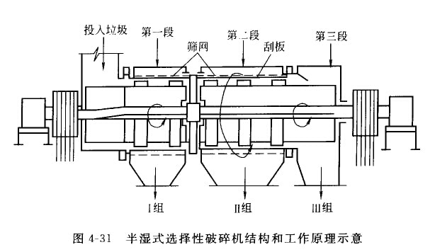 半濕式選擇性破碎分選是利用城市垃圾巾各種不同物質(zhì)的強(qiáng)度和脆性的差異,在一定濕度下破碎成不同粒度的碎塊,然后通過不同師 孔加以分離的過程。由于該過程是在半濕(加少量水)狀態(tài)下,通過兼釘選擇什破碎和篩分兩種功能的裝置小實(shí)現(xiàn)的,因此,把這種裝置 稱為半濕式選擇性破碎分選機(jī)。