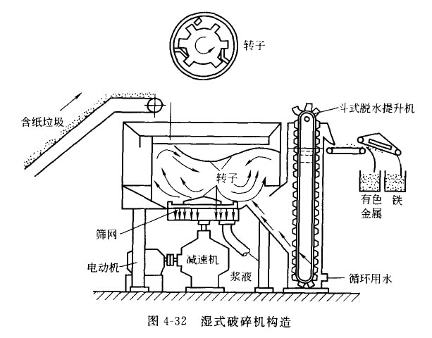 濕式破碎是利用特制的破碎機(jī)將投入機(jī)內(nèi)的含紙垃圾和大量水流一起劇烈攪拌和破碎成為漿液的過程,從間pJ以四收垃圾中的紙纖維 。這種使合紙垃圾漿液化的特制破砷機(jī)稱為濕式破碎機(jī)。濕式破碎技術(shù)是為回收城市坊圾巾的大量紙類為日的而發(fā)展起來的,美國(guó) Franklin市和日本東京都已經(jīng)安裝了濕式破碎機(jī),從城市垃圾中回收紙漿。