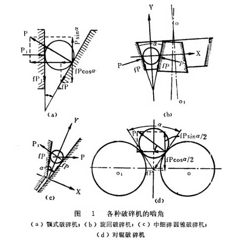 其它各種破碎機的嚙角都處在上述兩種破碎機嚙角形式之,因此極限嚙角都應(yīng)小于二倍摩擦角。所以,此結(jié)論適用于各種破碎機。