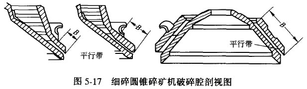 中、細(xì)碎圓錐碎礦機(jī)按其破碎腔形狀不同可分為標(biāo)準(zhǔn)型、中間型及短頭型三種。它們的構(gòu)造和工作原理完全相同,只是破碎膠的形狀不同,即平行帶的長度不同。如圖5-17所示。以標(biāo)準(zhǔn)型的平行帶最短,短頭型的平行帶最長,而中間型的平行帶長度介于二者之間。