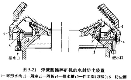 為了防止灰少進(jìn)入球面軸承和傳動(dòng)機(jī)構(gòu),破碎機(jī)設(shè)有防塵裝置,如圖5-21所示。在球面軸承的外緣有一環(huán)形水溝1,水在壓力作用下,沿水管進(jìn)入閑空2,然后通過隔板3上的許多小孔進(jìn)入環(huán)形水溝,并保持一定的高度,多余的水則從環(huán)形水溝攫至環(huán)形排水槽4的排水管流出。在動(dòng)錐下部邊緣上有碗形擋塵圈5(亦稱領(lǐng)緣),碗形擋塵困的自由端插在環(huán)形水溝中,用它將灰塵擋入水中并隨水排出,在排水溝的外側(cè)還裝有一層橡皮防塵田6,它與動(dòng)錐下部碗形擋塵困的外側(cè)相接觸,由于防塵圈是橡膠的,所以動(dòng)錐無論如何擺動(dòng),此防塵團(tuán)始終與碗形擋塵團(tuán)接觸,這樣可將大部分粉塵隔除,起到了第一道防塵作用,減輕了水封防塵的負(fù)擔(dān),從而更保證了設(shè)備的安全運(yùn)轉(zhuǎn)。