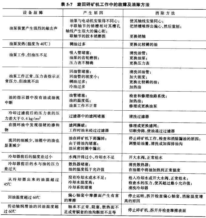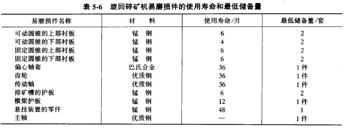 旋回破碎機主要易磨損件的使用壽命和最低儲備量可參見表5-6;旋回破碎機工作中產(chǎn)生的故障及其排除方法可參見表5-7。