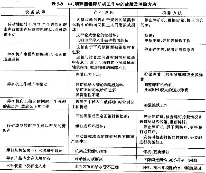 中、細(xì)碎圓錐破碎機(jī)易磨損零件的使用壽命和最低儲(chǔ)備量可參見表5-8;中、細(xì)碎圓錐破碎機(jī)在工作中產(chǎn)生的故障及消除方法可參 見表5-9。