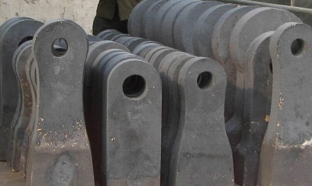 2、進(jìn)料粒度小于200mm的中小型破碎機(jī)可采用單重50kg以下的錘頭,由于受沖擊力相對(duì)較小,普通高錳鋼加工硬化能力不足,因而不耐磨,應(yīng)選擇含碳量較高的合金高錳鋼或中低碳合金鋼。
