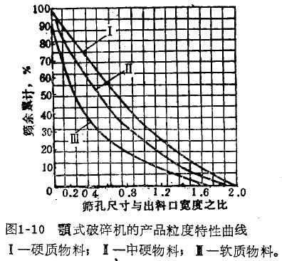 圖1-10為顎式破碎機的產(chǎn)品粒度特性曲線。破碎后產(chǎn)品粒度主要決定于出料口的尺寸大小,同時與物料的性質(zhì)和進料粒度有關。由圖可看出,產(chǎn)品中約15-35%的尺寸大于出料口尺寸,其中最大料塊尺寸相當于出料口的1.6-1.8倍。這在顎式破碎機選型及考慮下一工序的作業(yè)時,必須特別注意。