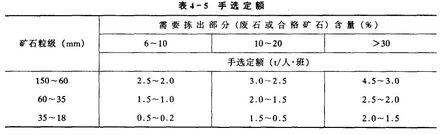 根據(jù)江西、廣東、湖南等省選礦廠的生產(chǎn)實(shí)踐統(tǒng)計(jì),皮石選出率為35%一7D%,手選工效約3t/人·班,手選回收率為96.5%一99.0%。手選定額如表4—5所示。