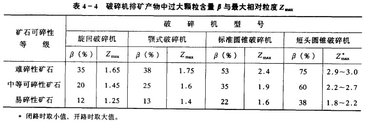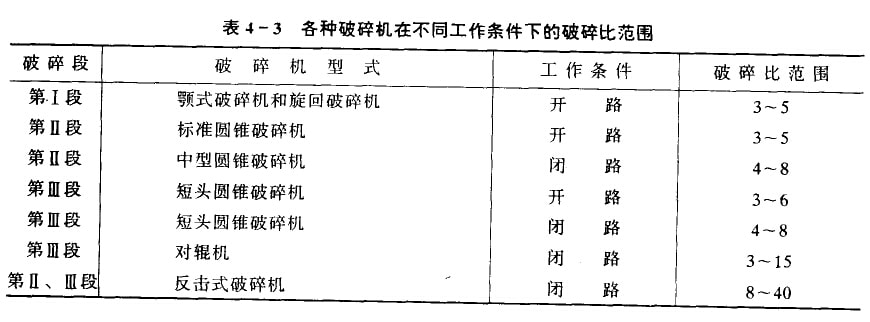 總破碎比等于各段破碎比之乘積。各段破碎比與各段破碎機(jī)的型式、流程類型和礦石性質(zhì)有關(guān):各種破辭扒在不同條件廠,其破碎比范圍,如表4—3所示(難碎性礦石取小值、易碎性礦石取大值)。