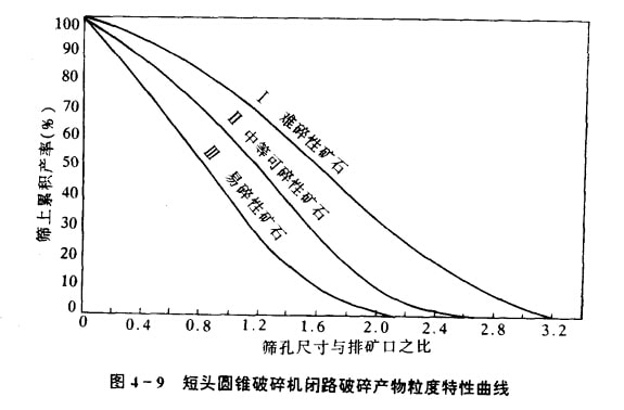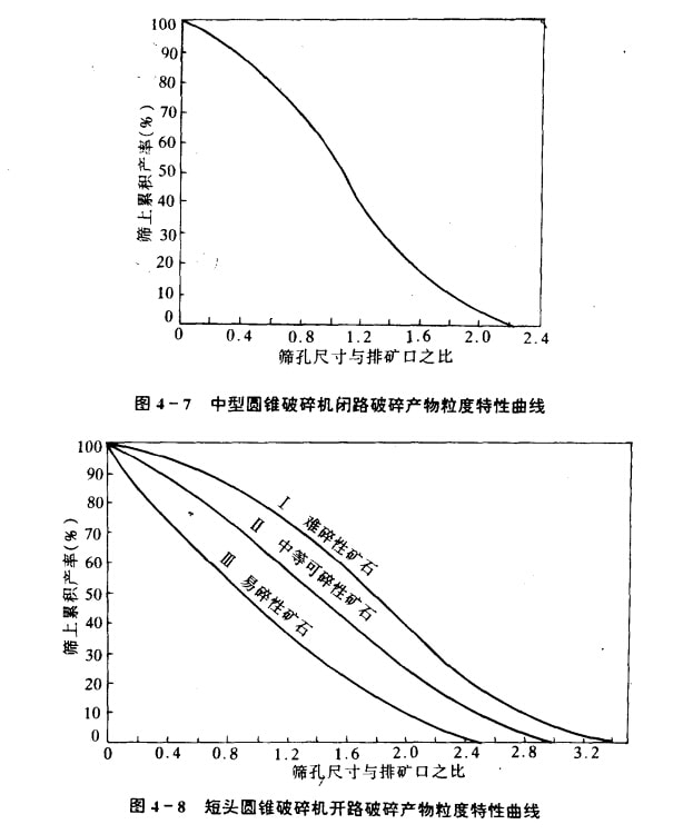 從表4—4可以看出,各種類型的破碎機(jī)的排礦產(chǎn)物中都有過大顆粒,而且過大顆粒的含量很高.如短頭圓錐破碎機(jī)破碎中等可碎性礦石時(shí),排礦產(chǎn)物中過大顆粒含量高達(dá)60%,最大粒度為排礦口寬度的2.2—2.7倍;破碎難碎礦石時(shí)更為嚴(yán)重,B=75%,Zmm=2.9—3.0。