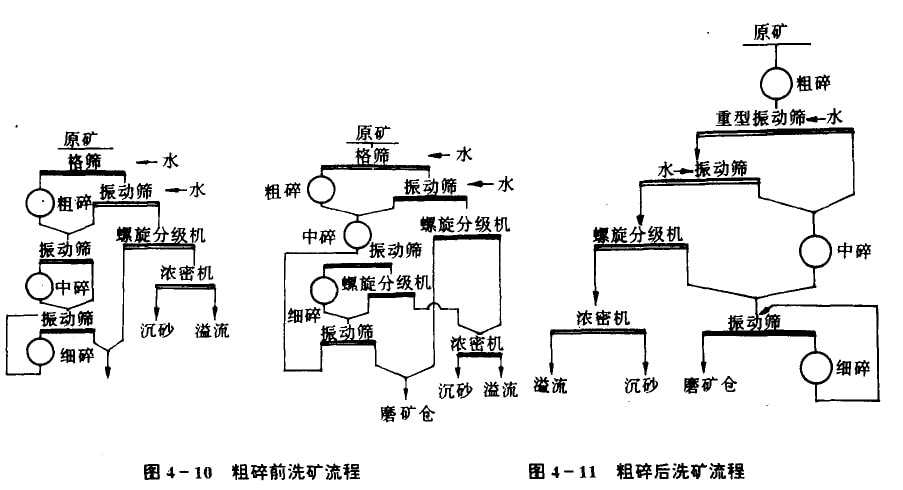 洗礦的典型流程,如圖4—Io,圖4—ll所示。洗礦后的礦泥有單獨(dú)處理和礦砂、礦泥合并處理兩種方案,采用哪種方案,視礦泥和礦砂的性質(zhì)而定。