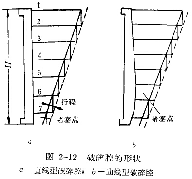 破碎腔的形狀有直線型和曲線型兩種。若兩種破碎腔的給礦口寬度、排礦口寬度、動顎的擺動行程和擺動次數(shù)均相同時,礦石在破碎腔內(nèi)的流動狀態(tài)如圖2-12所示。圖中實(shí)線表示顎板閉合時的位置,虛線表示顎板后退最遠(yuǎn)時的位置。