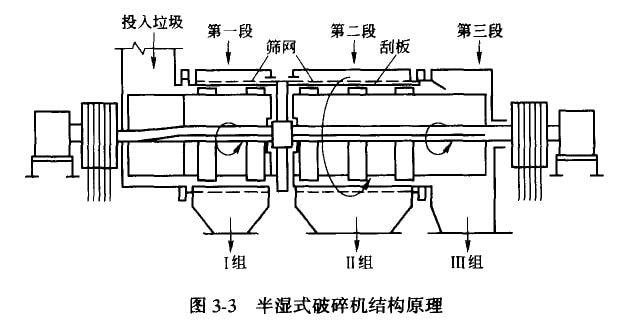 圖3—3所示為半濕式破碎機(jī)的結(jié)構(gòu)原理。該裝置由兩段具有不同尺寸篩孔的外旋轉(zhuǎn)圓筒篩和篩內(nèi)與之反方向旋轉(zhuǎn)的破碎板組成。垃圾在圓筒篩首端給入,并隨篩壁上升后又在重力作用下被拋落,拋落時(shí)受到反向旋轉(zhuǎn)的破碎板撞擊,垃圾中易脆物質(zhì)(An玻璃、陶瓷等)首先被破碎,通過第一段篩網(wǎng)分離排出。剽余垃圾進(jìn)入第二段篩網(wǎng),此段噴射水分,在水中易碎的紙類在水噴射下被破碎板破碎,由第二段篩網(wǎng)排出。最后剩余的垃圾(主要為金屬、塑料、橡膠、木材、皮革等)由不設(shè)篩網(wǎng)的第三段排出。