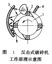 反擊式破碎機(jī)的工作部件為帶有板錘2的高速旋轉(zhuǎn)的轉(zhuǎn)子1;給人機(jī)內(nèi)的料塊在轉(zhuǎn)子回轉(zhuǎn)范圍(錘擊區(qū))內(nèi)受到板錘沖擊。物料是經(jīng)導(dǎo)板4給人錘擊區(qū)的,料塊被板錘沖擊后拋起;高速地撞在反擊板3上,再次受到?jīng)_擊,然后又從反擊板彈回板錘,繼續(xù)重復(fù)上述過(guò)程。在往返過(guò)程中,物料還互相碰撞,在沖擊、反彈、相互碰撞等作用下,物料料塊不斷產(chǎn)生裂縫、松散最后破碎.破碎的物料從機(jī)體下部卸出。參見(jiàn)圖1。