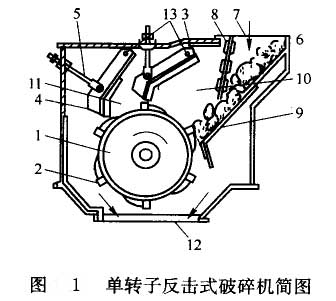 單轉(zhuǎn)子反擊式破碎機結(jié)構(gòu)見圖l。物料內(nèi)進料口7下到破碎機體6內(nèi)。為了防止破碎后的料塊從進料口飛出,在進料口處裝有一排鏈條8。給入的料塊落到算條篩9上。細小的碎塊經(jīng)篩下直送排料口12,大塊的物料順算條落到轉(zhuǎn)于1上。轉(zhuǎn)子軸上面裝有凸起一定高度的板錘2。板錘根據(jù)轉(zhuǎn)子直徑大小有4—6排。轉(zhuǎn)子由電動機經(jīng)過聯(lián)軸器和軸帶動轉(zhuǎn)子轉(zhuǎn)動。料塊就在高速旋轉(zhuǎn)的板錘和反擊板3之間來回碰撞破碎,在箅條篩、轉(zhuǎn)子l,第一反擊板3及進料口鏈條組成的空間內(nèi)形成強烈的沖擊區(qū)10,物料破碎后又落到反擊板3和反擊板4以及轉(zhuǎn)子1所組成的第二沖擊區(qū)11內(nèi)近一步受到?jīng)_擊粉碎。破碎后物料經(jīng)轉(zhuǎn)子下方排料口12排出。