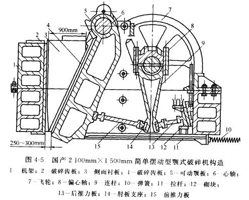 圖4-5所示為國產(chǎn)2100mm×1500mm簡單擺動型顎式破碎機構(gòu)造。該機由機架、工作機構(gòu)、傳動機構(gòu)、保險裝置等部分組成。其下固定顎和動顎構(gòu)成破碎腔。送入破碎腔中的廢料由于動顎被轉(zhuǎn)動的偏心軸帶動呈往復(fù)擺動而被擠壓、破裂和彎曲破碎。當(dāng)動顎離開固定顎時,破碎腔內(nèi)下部己破碎到小于排料口的物料靠其自身重力從排料口排出,位于破碎腔上部的尚未充分壓碎的料塊當(dāng)下落一定距離,在動顎板的繼續(xù)壓碎下被破碎。