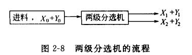 兩級分選機的流程如圖2-8所示。在兩級分選機中,給入的物料是由X和Y組成的混合物,X、Y為待分選的物料。單位時間內(nèi)進(jìn)入分選機的物料X和物料Y的量分別為Xo和Yo;單位時間內(nèi)物料X和物料Y從第一排出口排出的量分別為X1和Y1;從第二排出口排出的量分別為X2和Y2。假定要求該二級分選機將物料X選入第一排出口,將物料Y選人第二排出口,如果該分選機效率足夠高,那么物料X都通過第一排出口排出,物料Y都通過第二排出口徘出。實際上,從第一排出口排出的物料流中會含有部分物料Y,而從第二排出口中排出的物料流中也會含有部分物料X,因此就存在分選效率的問題。